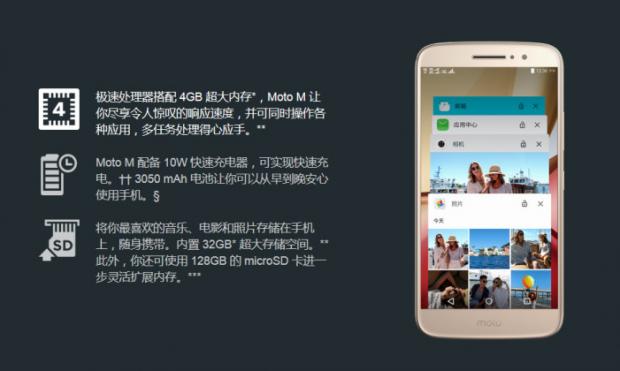 Viên pin bên trong Moto M có dung lượng 3050mAh, hỗ trợ sạc nhanh thông qua cổng USB Type-C. Máy còn có lớp phủ nano coating để chống nước và đáng tiếc là chỉ chạy sẵn Android 6.0.1 chứ không phải Android 7.0 Nougat.