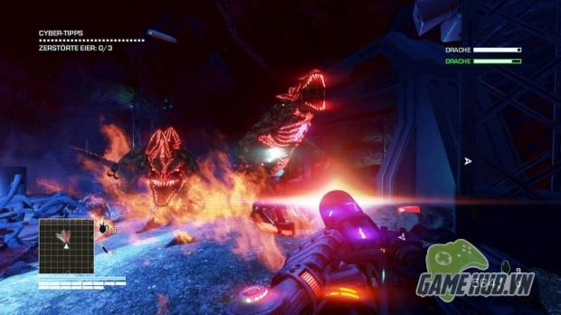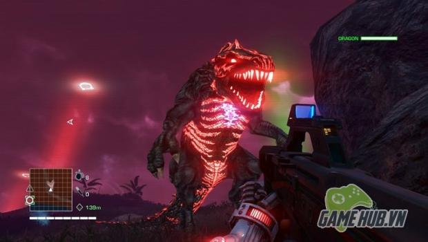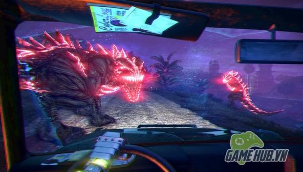 Nhưng như danh đặt tựa game gợi ý, ngôi sao chính của Far Cry: Blood Dragon là... Blood Dragon. Loài 'rồng' mang hình dáng của một con T-Rex khổng lồ này là bá vương đích thực của tựa game khi sẵn sàng tiễn bạn lên đường chỉ bằng vài phát táp. Không những vậy sinh vật này còn có khả năg phóng laser từ hai mắt, sẵn sàng thổi tung cả một chiếc xe jeep từ khoảng cách xa. Chúng sinh sống và săn mồi khắp nơi trên hòn đảo, vì thế bạn phải cực kỳ cẩn thận nếu không muốn mình trở thành miếng thịt trong miệng Blood Dragon.