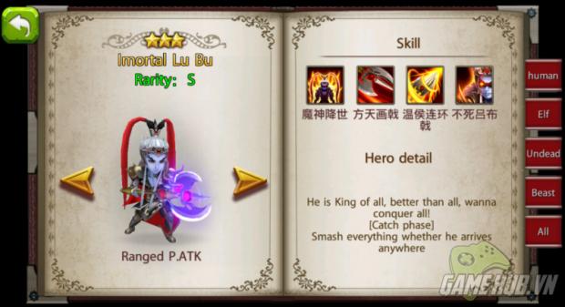 Là vị tuyệt thế mãnh tướng sinh ra trong thời Tam Quốc loạn lạc khói lửa, Lã Bố đã thức tỉnh từ quá khứ và vươn mình lên thành hệ Bất Tử (Undead) trong AOA, tăng 200% lực chiến. Khi đối diện với kẻ địch, Lã Bố sẽ tung tuyệt chiêu khiến kẻ địch rơi vào trang thái quay cuồng điên loạn, đồng thời thiêu đốt kẻ địch trong phạm vi 5m. Khi làm Follower, Lã Bố sẽ tăng thêm 60% thuộc tính tấn công vật lý cho đồng đội.