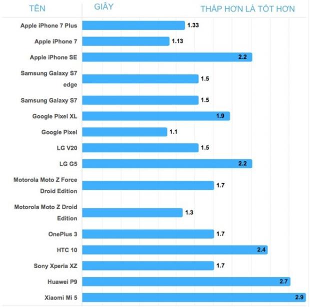 Ở đây, chúng ta có một cuộc đua thú vị giữa Google Pixel và Apple iPhone 7. Tuy nhiên, những smartphone xếp ngay sau như Samsung Galaxy S7 hay LG V20 cũng cho tốc độ không tồi.
