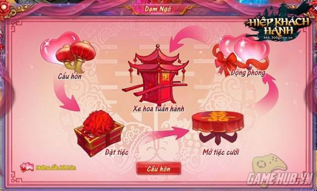 Quy trình Kết hôn trong Hiệp Khách Hành bao gồm các giai đoạnCầu hôn > Đặt tiệc >Tiệc cưới > Đông phòng > Diễu hành xe hoa.