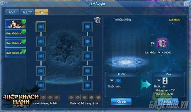 Người chơi có thể thu thập 5 loại thẻ bài khác nhau, tạo thành 1 bộ bài giúp tăng thuộc tính đặc biệt cho người chơi. Có tất cả 10 ô chứa bài, tạo thành hai bộ. Khi đủ bộ, các thuộc tính sẽ mở, chẳng hạn: Sảnh 5 hoặc Cù lũ sẽ miễn thương +2%; 5 lá như nhau miễn thương +6% hoặc thùng phá sảnh 10 sát thương +6%,… Điểm thú vị của tính năng này chính là việc chọn Hiệp khách tùy ý ứng với các thuộc tính mà thẻ bài quy định.