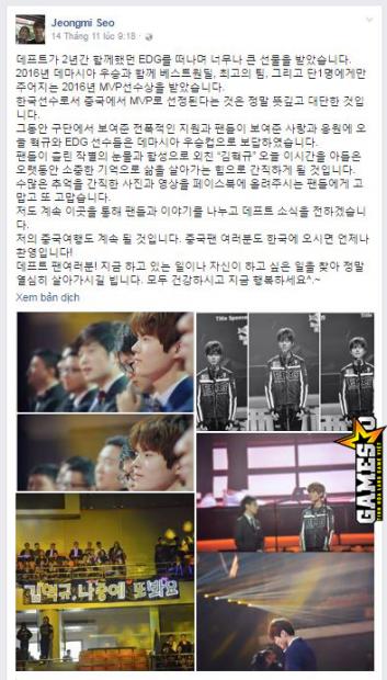 Kim “Deft” Hyuk-kyu đã tuyên bố quyết định chia tay EDward Gaming ngay sau khi giải đấu Demacia Cup 2016 kết thúc. Và sau khi đội tuyển này bảo vệ thành công chức vô địch, mẹ của Deft, cô Seo, đã viết một thông điệp đầy cảm động gửi tới những fan hâm mộ Trung Quốc của con trai trên Facebook.
