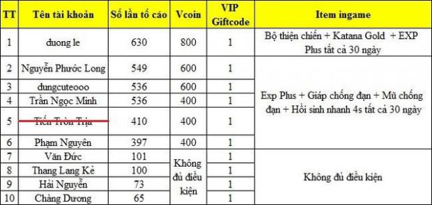 “Thợ săn” Duong Le đứng đầu bảng tháng 10 với 630 lần tố cáo, quả là đáng nểTheo thống kê của BQT thì trong tháng 10 có đến hơn 500 người chơi tham gia săn bắt hack. Tuy nhiên “quà” thì chỉ trao cho 10 “chiến sĩ” có kết quả tố cáo cao nhất, nên đôi khi những người ở ngoài top 10 dù làm việc chăm chỉ nhưng không được thưởng cũng cảm thấy hơi bất công. Hy vọng NPH và BQT sắp tới sẽ dành nhiều phần quà hơn cho các chiến sĩ săn bắt hack để họ có thêm động lực làm việc và có được những phần thưởng xứng đáng với công sức mà mình bỏ ra.