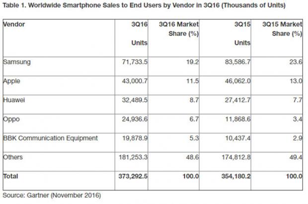 Apple, mặt khác, đã mất đi một số sức hút thị trường khi doanh số bán hàng giảm khoảng 3 triệu sản phẩm. Và cũng giống như Samsung, Apple cũng đã trải qua một đợt sụt giảm mạnh về thị phần - từ 13% (quý III năm 2015) xuống 11,5% (quý III 2016).