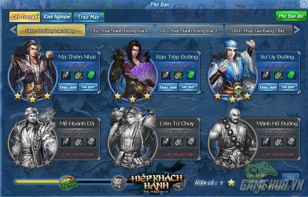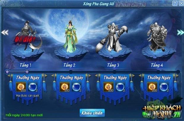 Khi đạt đến cấp 23, nhân vật đã bắt đầu có thể tìm kiếm nguyên liệu tiến cấp Hiệp khách. Hiệp Hồn chiêu mộ Hiệp khách, làm phong phú trận hình; Chiến Hồn nâng cấp Hiệp khách, gia tăng sức mạnh nhân vật. Xông pha giang hồ với nhiều tầng boss khác nhau, tầng càng cao thì độ khó của boss càng tăng để thêm phần thách thức người chơi. Ngoài Hiệp Hồn Lam-Cam và Chiến Hồn thì hoạt động này còn ngẫu nhiên cho ra Mảnh Xông Pha Giang Hồ để tăng cấp Đồ giám.