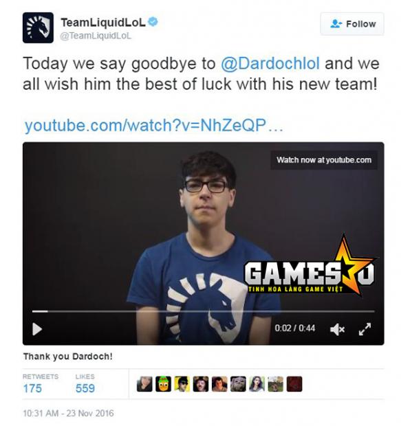 “Mùa giải tới sẽ rất thú vị với tôi bởi tôi sẽ cơ bản có một khởi đầu mới và tôi không còn chơi cho tổ chức Team Liquid nữa”, Dardoch nói trong một tập phim của Liquid LOL.
