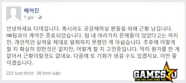 Dade mở đầu thông báo bằng việc nói với các fan hâm mô rằng hợp đồng của anh đã hết hạn với Newbee. Cựu tuyển thủ của Samsung Blue nói thêm, khi anh chơi cho Newbee, đội tuyển này có rất nhiều vấn đề, nhưng mình không liên can và Dade không thể thi đấu với khả năng tối đa được. Bản thông báo cũng đề cập thêm Dade vẫn chưa quyết định sẽ làm gì, ẩn ý rằng hiện tại vẫn chưa rõ Dade có tiếp tục ký thêm hợp đồng với Newbee hay không hoặc đã có lựa chọn khác.