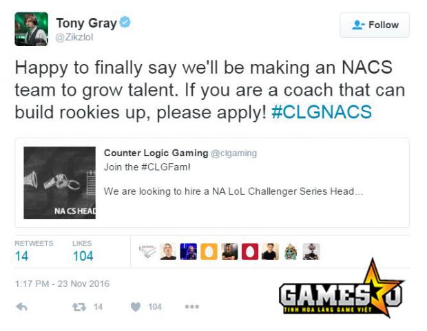 Thông tin này được tiết lộ bởi một đoạn tweet do HLV Trưởng của đội hình CLG đang thi đấu tại LCS Bắc Mỹ, Tony “Zikz’ Gray viết.