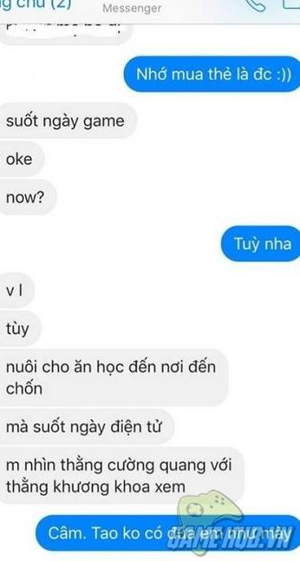 Giả thiết anh em hơn kém nhau 1, 2 tuổi nói chuyện ngang hàng cũng là điều thường thấy ngoài đời. Nhưng nếu nói về vị chủ thớt này, mải chơi game quên học đã là không đúng, chơi game xong nhờ em mua thẻ game lại càng không đúng.