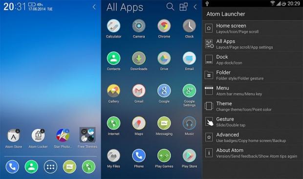 Atom cũng là một launcher có nhiều tính năng tùy biến, trong đó thú vị hơn cả là trình tạo theme. Người dùng có thể tự thiết kế theme và chia sẻ với người khác. Launcher hoạt động rất mượt mà.