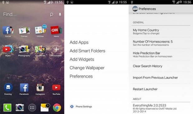 EverythingMe Launcher là một launcher hoạt động theo ngữ cảnh, được quảng cáo là có thể “dự đoán” ứng dụng người dùng muốn sử dụng ở một thời điểm nào đó. Theo thời gian trong ngày, launcher này sẽ gợi ý những ứng dụng bạn có thể muốn dùng nhất. Ví dụ, EverythingMe Launcher sẽ gợi ý bạn dùng các ứng dụng đọc tin tức vào buổi sáng, ứng dụng làm việc vào ban ngày và thậm chí gợi ý địa chỉ các nhà hàng nếu nó phát hiện bạn đi ra ngoài vào buổi tối. Tuy nhiên, EverythingMe Launcher không có nhiều lựa chọn tùy chỉnh.