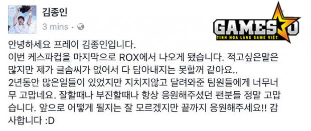 PraY viết: “Xin chào, tôi là PraY, Kim Jong-in. Sau khi kết thúc KeSPA Cup, tôi đã rời ROX. Có rất nhiều điều mà tôi muốn viết, nhưng kỹ năng viết của tôi không được tốt nên tôi không nghĩ tôi sẽ có thể nói hết tất cả những điều mình muốn…Chúng tôi đã trải qua rất nhiều thứ trong suốt hai năm, và gửi tới đồng đội của tôi, nhưng người đã làm việc không biết mệt mỏi để vượt qua nó, (tôi muốn nói) cám ơn các cậu rất nhiều. Tôi không chắc những gì sẽ đến sau đây, nhưng xin hãy tiếp tục cổ vũ cho tôi. Cám ơn các bạn :D”