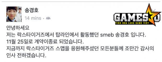 Smeb viết: “Xin chào, tôi là cựu đường trên của ROX Tigers Smeb Song Kyung-ho. Vào ngày 25/11, hợp đồng của tôi đã kết thúc. Tôi muốn gửi lời cám ơn tới tất cả những người đã cổ vũ cho tôi trong suốt quãng thời gian với tư cách ROX Tigers Smeb”