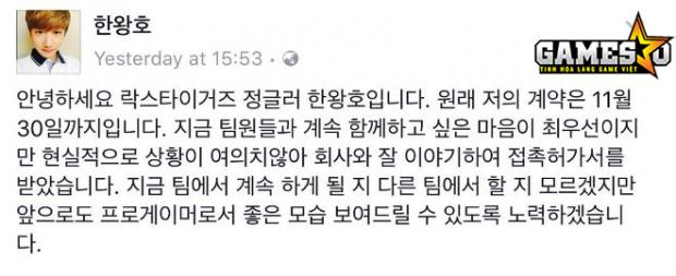 Peanut viết: “Xin chào, tôi là tuyển thủ đi rừng Han Wang-ho của ROX. Hợp đồng của tôi còn hạn tới ngày 30/11. Ngay bây giờ, tôi muốn tiếp tục với đội của mình, nhưng tình hình thực tế lại không được như mong đợi, vì thế tôi đã được cho phép tiếp nhận những lời đề nghị của các đội tuyển khác. Hiện tại, tôi không chắc liệu mình sẽ tiếp tục thi đấu cho đội hoặc tới nơi khác, nhưng tôi sẽ tiếp tục làm việc chăm chỉ để thể hiện mình tốt nhất trong tư cách là một game thủ chuyên nghiệp”