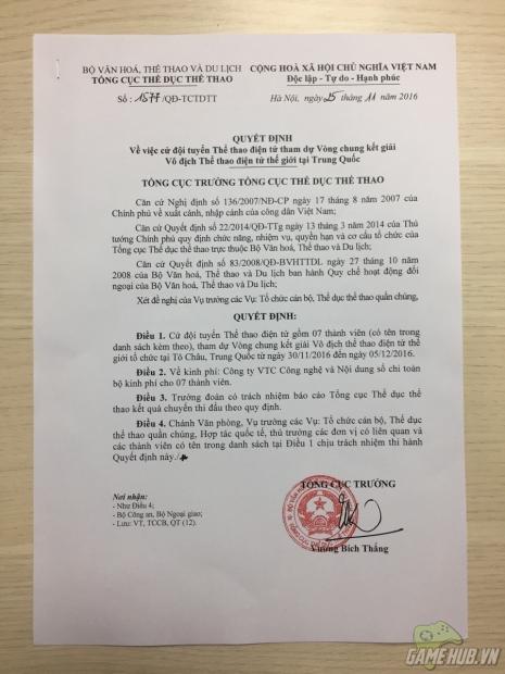 Quyết định cử Freedom Gaming đi thi đấu tại Trung Quốc do Tổng cục Trưởng tổng cục Thể dục Thể thao Vương Bích Thắng ký.