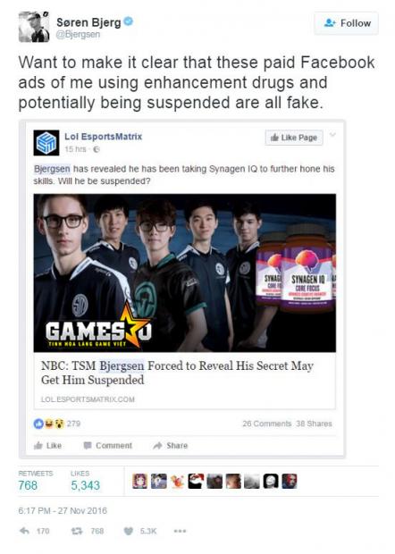 “Những quảng cáo mất phí trên Facebook về tôi sử dụng các loại thuốc tăng cường và có khả năng bị đình chỉ hoàn toàn giả mạo”, Bjergsen khẳng định trên trang Twitter cá nhân. “Họ đang cố gắng sử dụng tên tuổi của tôi để bán được sản phẩm của họ, xin hãy báo cáo quảng cáo đó nếu nó hiện lên bảng tin của bạn.”