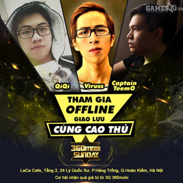 Sự kiện Offline giao lưu cùng cao thủ: đây là một dịp hiếm hoi để game thủ có thể trao đổi, học hỏi với các cao thủ nổi tiếng của cộng đồng như QiQi hay Captain TeemO, và đặc biệt hơn cả là sự tham dự của bình luận viên ViruSs - anh đồng thời là một game thủ 3Q 360mobi kỳ cựu và có tiếng tăm, là “ông bầu” tài trợ cho chính đội ViruSs Eternity, kỳ phùng địch thủ của á quân thế giới - Saigon Phantom.