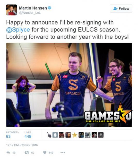 Martin 'Wunder' Hansen đã tiếp tục đặt bút ký vào bản hợp đồng mới với Splyce. Điều này tức là cả năm tuyển thủ có tên trong tổ chức ở mùa giải 2016 sẽ tiếp tục thi đấu cho Splyce ở mùa giải 2017 sắp tới.
