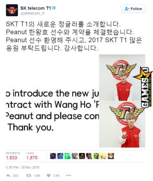 Han 'Peanut' Wang-ho đã chính thức gia nhập SK Telecom T1 ở mùa giải 2017, theo một thông báo chính thức trên trang Twitter của đội.