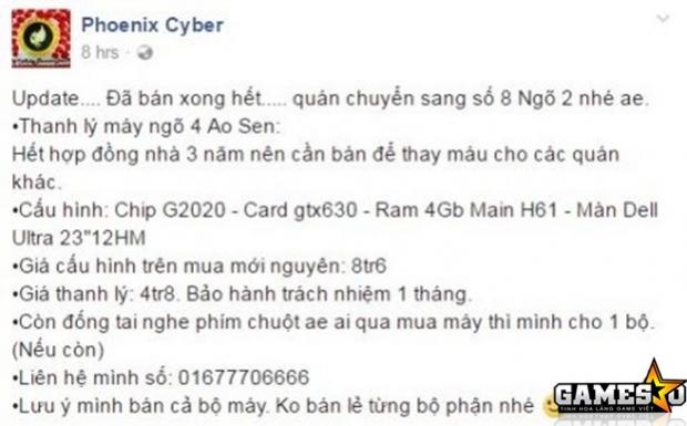 Ông chủ của Phoenix Cyber, người đã từng đặt một khuyến mãi cực khủng cho game thủ đỗ đại học bằng cách miễn phí 4 năm chơi game, giờ đây lại tiếp tục gây shock với màn thanh lý máy cấu hình khá ổn với mức giá siêu rẻ, tặng kèm luôn cả bộ chuột bàn và bàn phím. Post mới nhất của Phoenix Cyber cho biết: