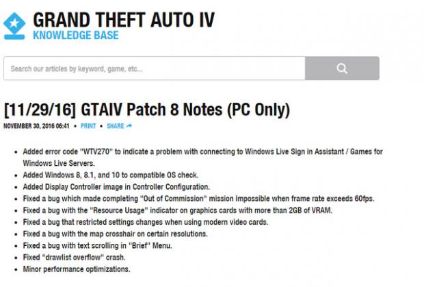 Thông báo mới cập nhật trên trang chủ của Rockstar về patch mới dành cho GTA IV.