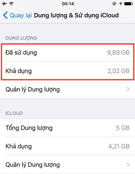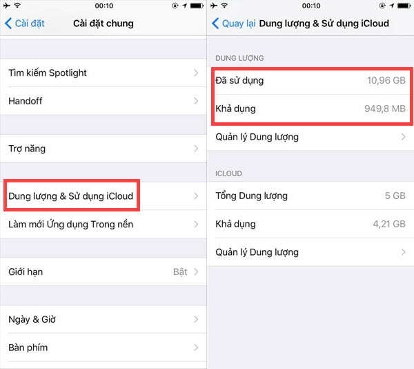 Tiếp đó chọn mục 'Dung lượng & sử dụng iCloud', bạn sẽ thấy được dung lượng đã sử dụng cũng như dung lượng còn trống. Trong ví dụ dưới đây, chiếc iPhone 6 đã sử dụng 10,96 GB, còn trống 949,8 MB