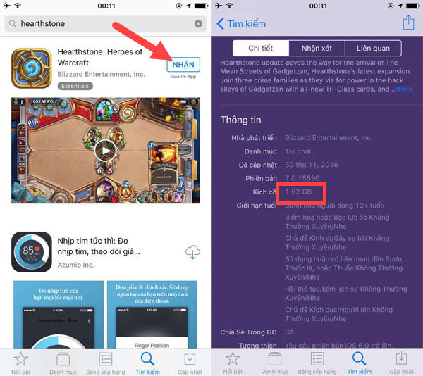 Công việc tiếp theo, hãy truy cập vào AppStore, tải thử nghiệm 1 game có dung lượng lớn. Chúng tôi lựa chọn tựa game Hearthstone có dung lượng 1,92GB.