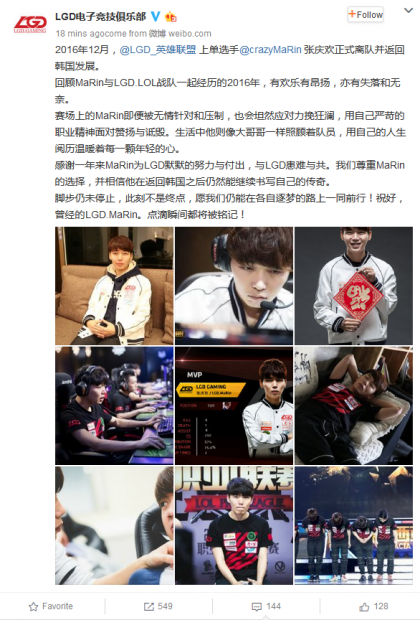Sau những thất bại ê chề ở LPL cũng như Demacia Cup, MaRin đã chính thức kết thúc hợp đồng với LGD Gaming vào sáng nay. Anh chính thức trở về Hàn Quốc và tìm kiếm 1 bến đỗ mới cho riêng mình. Thông tin này đã chính thức được ban lãnh đạo LGD đăng tải trên trang weibo chính thức của đội tuyển này.