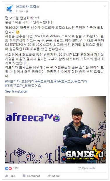 Xạ thủ Ha 'Kramer' Jong-hun đã gia nhập Afreeca, theo thông báo chính thức của đội vào tối qua (07/12).