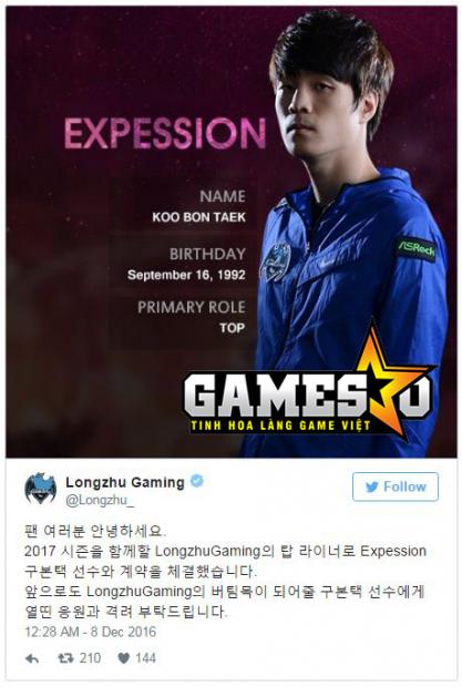 Koo 'Expession' Bon-taek đã ký hợp đồng mới với Longzhu cho mùa giải 2017, theo thông báo mới nhất của tổ chức trên Twitter.
