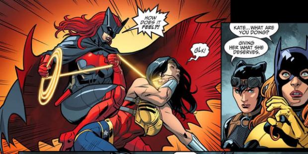 Và trong cuộc chiến này Wonder Woman đã chọn đứng về phía phe Superman, đối đầu với những người đồng đội cũ như Catwoman, Batwoman, Huntress... Trong khi cố gắng đánh nhau với Huntress, Diana đã suýt giết chết cô nàng này khiến cho Batwoman đứng ở ngoài cũng cảm thấy khó chịu nên đã giật lấy sợi dây của Wonder Woman, trói và cho cô nếm lại mùi vị sự đau đớn mà cô đã gây ra.