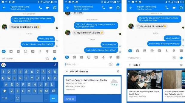 Tương tự như bên iOS, nút chữ G sẽ cho phép bạn tìm kiếm nhanh ngay từ bàn phím, không cần mở Google Search hay trình duyệt. Đây cũng là một trong những bổ sung đáng giá nhất của GBoard cho Android. Bạn có thể search thông tin chung chung dạng 'thời tiết hôm nay' hoặc 'dân số Việt Nam' để thấy nhanh câu trả lời. Bạn cũng có thể tìm một số tin tức, khi bấm vào thì link sẽ tự động chèn vô khung soạn thảo văn bản của bạn, tiện khi chat, trao đổi email với người khác.