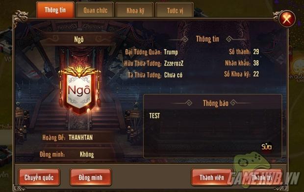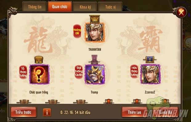 Hệ thống quan chức trong game chia ra làm nhiều tước vị khác nhau, cao nhất là Hoàng Đế, dưới là Tả Thừa Tướng, Đại Tướng Quân, Hữu Thừa Tướng và các cấp bậc ở dưới hơn nữa. Trong đó, rõ ràng Hoàng Đế sẽ là người nắm giữ nhiều quyền lực nhất khi có thể phát lệnh Quốc Chiến tấn công 1 quốc gia, tự tạo thêm Đất Phong sản xuất tài nguyên, di chuyển quân đội, bổ nhiệm tướng tài… Do đó, nó cũng là tước vị khiến bất cứ ai cũng phải thèm muốn.