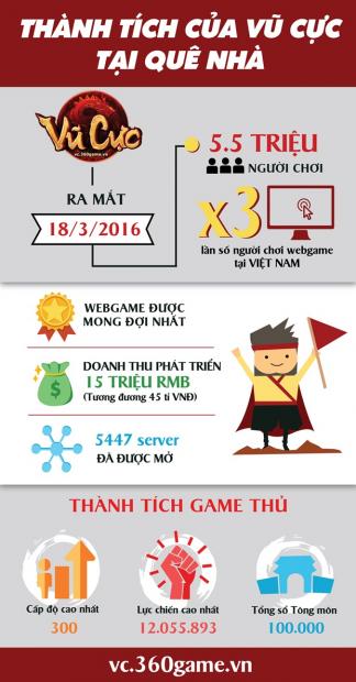 Nhìn tổng quan các con số thật ấn tượng với 5,5 triệu người tham gia tại quê hương Vũ Cực. Số lượng theo đánh giá facebook gấp 3 lần số lượng người tham gia web game tại Việt Nam. Là một trong những sản phẩm được mong đợi nhất tại thị trường bản địa. Đã có hơn 5000 máy chủ được mở ra để đáp ứng cho số lượng người chơi khủng. Các game thủ tham gia gắn bó cùng Vũ Cực từ những lúc đầu đến hiện tại cũng đạt những thành tựu đáng khen thưởng. Tốc độ luyện thật kinh khủng với đẳng cấp 300 cao nhất toàn cõi Võ Hiệp, hơn 12 triệu lực chiến người chơi có thể oanh tạc khắp nơi. Bên cạnh đó số lượng Tông môn đươc tạo ra 100 nghìn để cùng nhau tham gia chiến đấu, đánh quân đoàn.