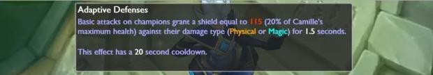 Cứ mỗi 20 giây, khi Camille đánh thường lên kẻ địch, trò chơi tính toán nhanh chóng xem đâu là dạng sát thương chủ lực của mục tiêu. Camille sau đó sẽ có một lớp giáp, STVL hoặc SMPT, có lợi để bảo vệ cô nàng hơn. Nó có cách thức tính toán riêng biệt, không phụ thuộc vào chất tướng, tạo nên cái hay của Nội tại.