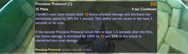 Giao Thức Chuẩn Xác là một kỹ năng cực kỳ mạnh giúp cho Camille có cơ hội hai lần tái tạo đòn đánh thường trong một khoảng thời gian ngắn. Kích hoạt Q sẽ tái tạo đòn đánh thường và gây thêm sát thương cùng với gia tăng tốc độ di chuyển của Camille. Sau khi dùng Giao Thức Chuẩn Xác lên một mục tiêu, Camille sẽ có cơ hội kích hoạt kỹ năng thêm lần nữa