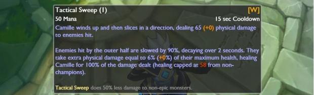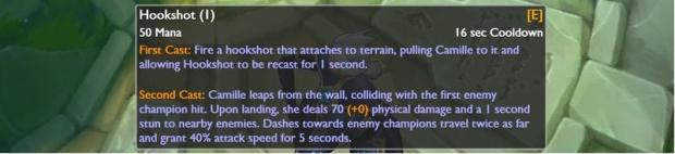 Bắn Dây Móc cực kỳ mạnh, không thể đoán trước được và giúp Camille rất nhanh nhẹn trong chiến đấu. Luôn tìm kiếm những góc cạnh tốt, và đừng quá sợ hãi khi lướt tới chủ lực của địch nếu bạn có cơ hội. Đặc biệt là khi có cơ hội kích hoạt…