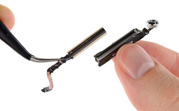 Phần case sạc cũng tương tự. Nó không có bất kì phần tiếp giáp nào có thể mở ra dễ dàng, và bạn hãy xác định là phải phá hỏng nó nếu muốn tháo ra như hình trên đây. Có một điểm rất đáng chú ý trong phần case sạc này, là một trong những con chip điều khiển có vẻ như được sản xuất với chất lượng rất thấp.