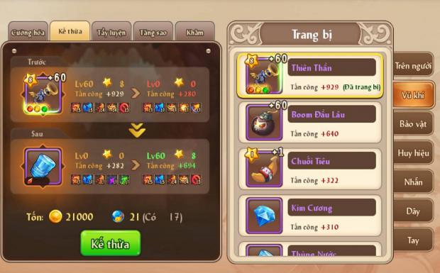 Kế thừa trang bị sẽ truyền toàn bộ cường hóa, tăng sao, kỹ năng (vũ khí) của trang bị kế thừa sang cho trang bị được kế thừa và ngược lại.