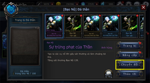 - Bạo nộ Đặc Tính: Chuyển đổi ngẫu nhiên thành một loại Đá Thần Bạo Nộ hoặc Đá Thần Thuộc Tính.