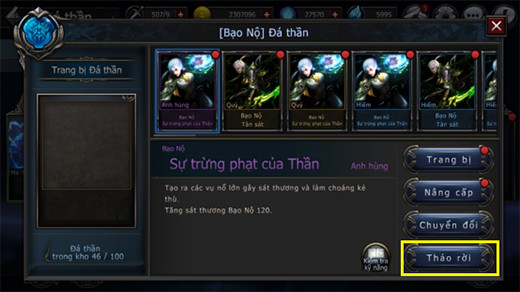 - Mỗi ô sẽ ứng với một số loại Đá Thần. Hãy chọn loại đá tốt nhất và chọn 'Trang Bị':