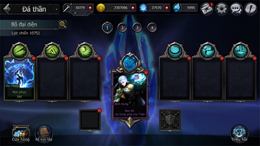 - Tại giao diện chính của Đá Thần, bạn hãy click vào từng ô trống để trang bị Đá Thần vào đó: