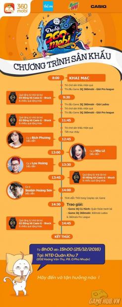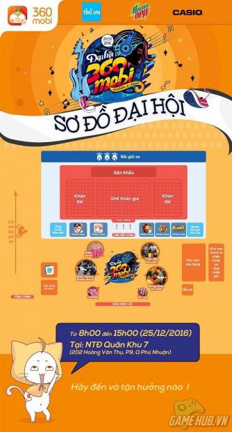 Những bạn tham gia cũng đừng quên lưu lại sơ đồ của Đại Hội 360mobi để có thể nhắm đúng mục tiêu và “triển” nhé. Hẹn gặp lại các bạn lúc 08h00 ngày 25/12 tại Nhà Thi Đấu Quân khu 7! Đại Hội 360mobi năm 2016 hân hạnh được tài trợ bởi Công ty cổ phần Tiki, nhãn hàng nước giải khát Moutain Dew và Công ty TNHH ANH KHUÊ SÀI GÒN – nhà phân phối chính thức và duy nhất sản phẩm đồng hồ CASIO tại thị trường Việt Nam.