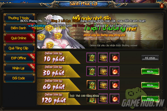 Chưa hết, lợi ích Vũ Cực tặng cho người chơi ngoài những điều kể trên còn được xây dựng thành một hệ thống nằm trong Sảnh Phúc Lợi. Trong Sảnh chứa rất nhiều phần quà đến từ nhiều nguồn gốc khác nhau, những điều kiện như nhận quà 7 ngày Online, quà điểm danh hay quà lên cấp là rất dễ dàng đối với những người chơi thông thường.