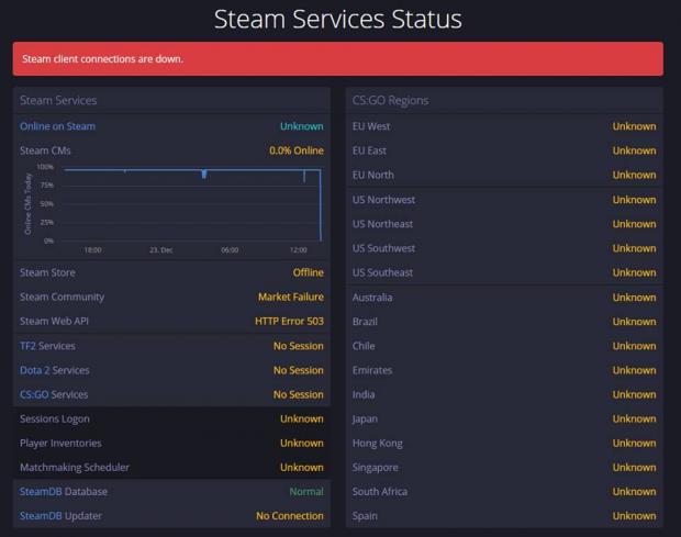 Dựa theo thông tin của trang web https://steamstat.us/, toàn bộ các server của Steam tại các khu vực đều không có kết nối: