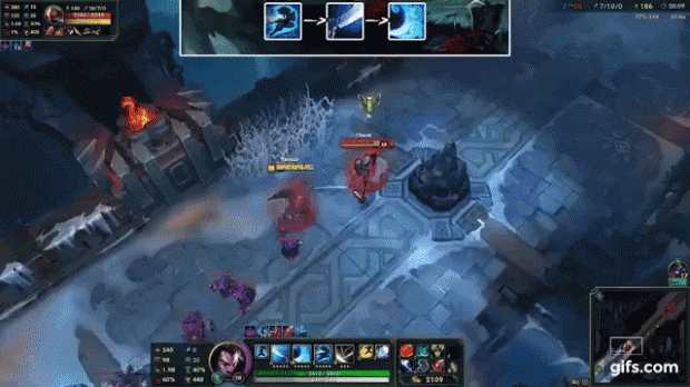 9. Sau khi động tác dùng chiêu của chiêu cuối đã xong hết, hãy dùng combo phổ thông nhất đánh thường + (Q) + đánh thường để gây thêm sát thương. (Điều này chắc ai cũng biết).