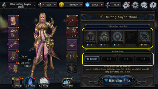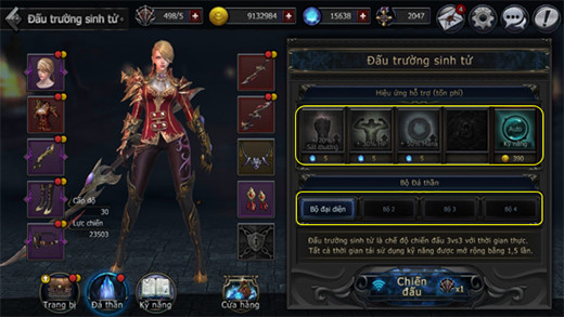 + Trong giao diện chuẩn bị, bạn có thể dùng vàng và gem mua các chức năng trợ chiến như tự động sử dụng kỹ năng, tăng sát thương, tăng máu, tăng mana, cũng như lựa chọn bộ Đá Thần hợp lý: