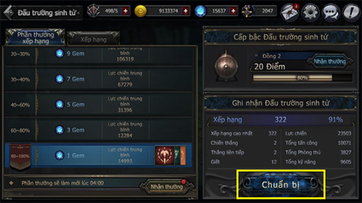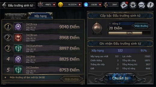 + Tại đây bạn có thể xem xếp hạng của bản thân, xếp hạng top đấu trường cũng như phần thưởng hàng ngày có thể nhận được: