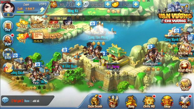 Không hề có sự xuất hiện của các công trình có thể nâng cấp như game SLG ở giao diện chính, thay vào đó trong Vạn Vương Chi Vương thì các cửa ải sẽ nằm luôn ở giao diện này và được hiển thị thời gian thực theo đúng quá trình khám phá của người chơi. Các game thủ cũng có thể nhìn thấy người chơi khác nếu họ đang ở chung khu vực và đang online, họ có thể lựa chọn kết bạn, xem thông tin hay thi đấu với nhau. Đây là tính năng khá mới lạ của game giúp tăng tính tương tác và bớt tự kỷ.